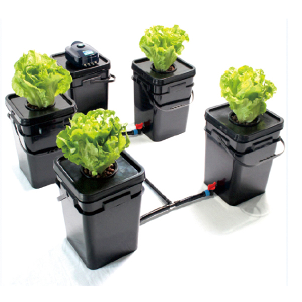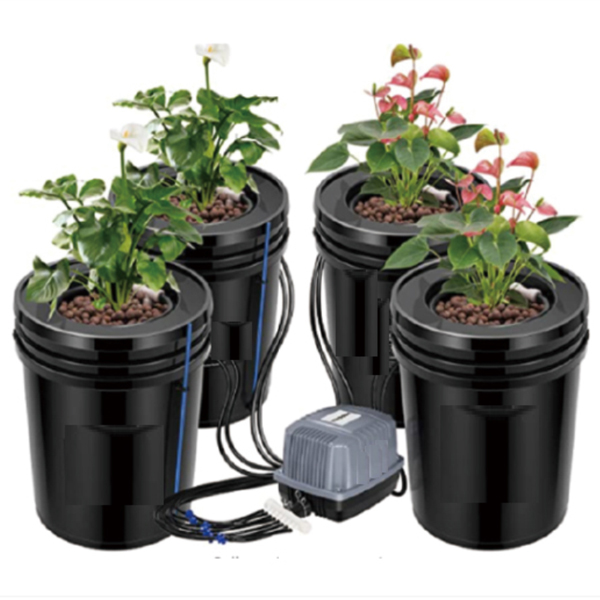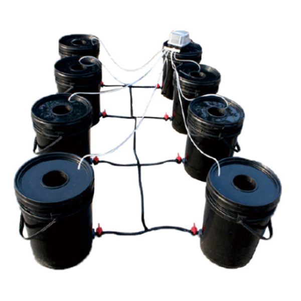 Sets of DWC hydroponic system include: 20L Buckets, Net cups, Nutrient pump, Air hose, Air stone, Air low adjustable valve, Ring drip irrigation set, Water level and drainage fitting, Main pipe with accessories